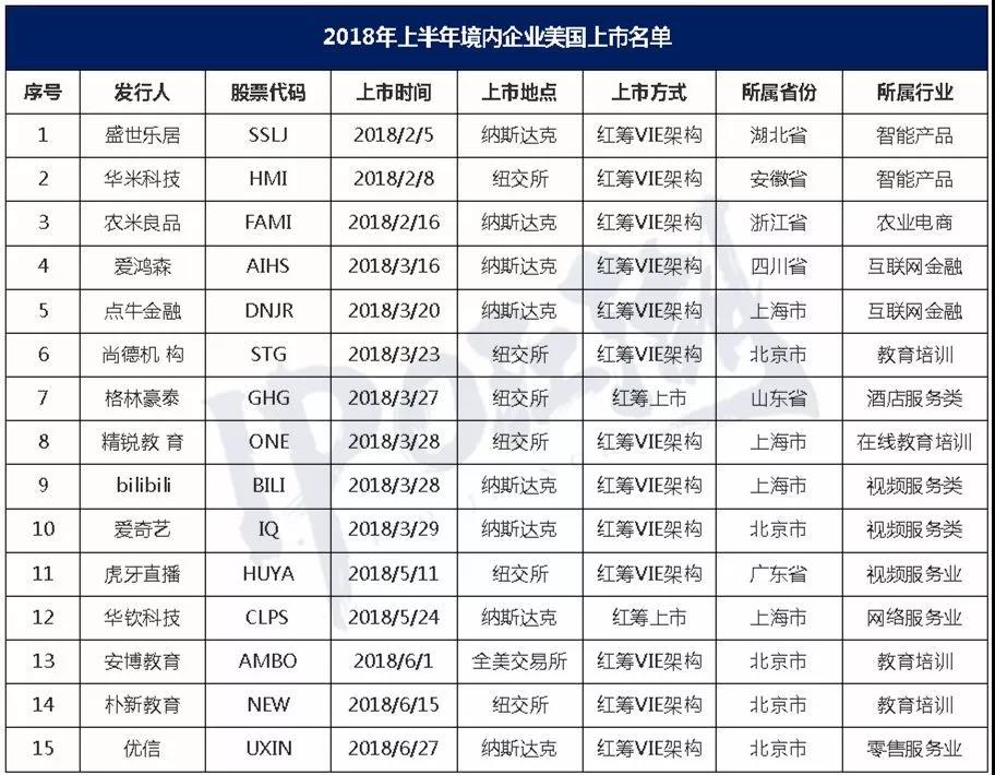 2018 年上半年,共有15家中國企業(yè)赴美上市。