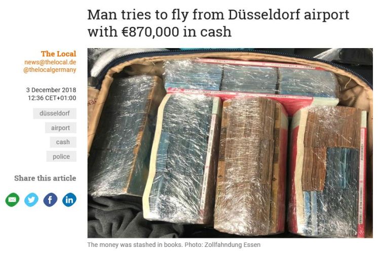 據(jù)德國(guó)海關(guān)當(dāng)局稱,近期在德國(guó)西部Dusseldorf機(jī)場(chǎng),一名安檢人員發(fā)現(xiàn)一名26歲華人登機(jī)時(shí),箱內(nèi)的物品異常,隨即要求開(kāi)箱檢查,經(jīng)工作人員檢查發(fā)現(xiàn),箱內(nèi)有87萬(wàn)歐元現(xiàn)金均被該華人偽裝成中文書(shū)籍,試圖攜帶離境。