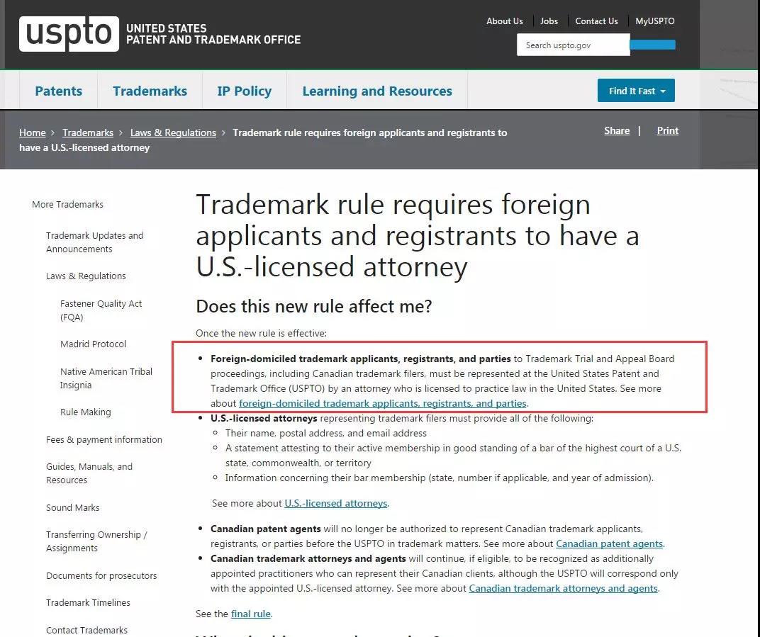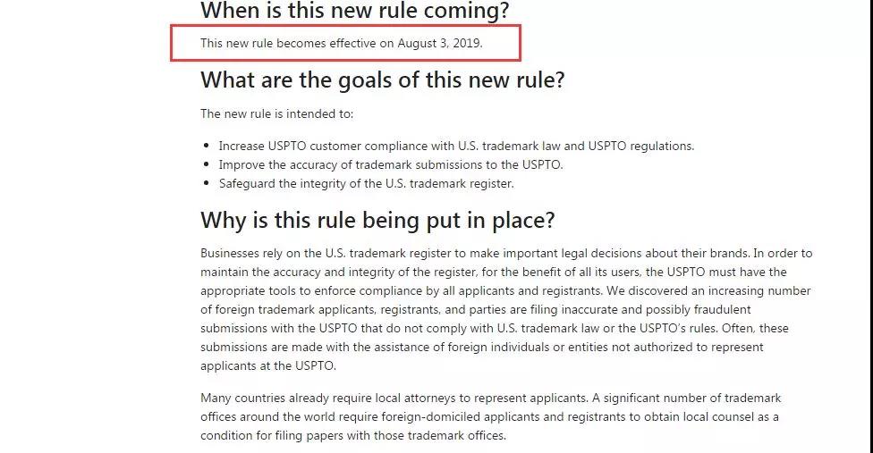 7月2日,美國(guó)專利商標(biāo)局(USPTO)官宣:新的商標(biāo)規(guī)則,要求外國(guó)商標(biāo)申請(qǐng)人必須由在美國(guó)執(zhí)業(yè)的律師代理,新商標(biāo)規(guī)則的生效日期為2019年8月3日。