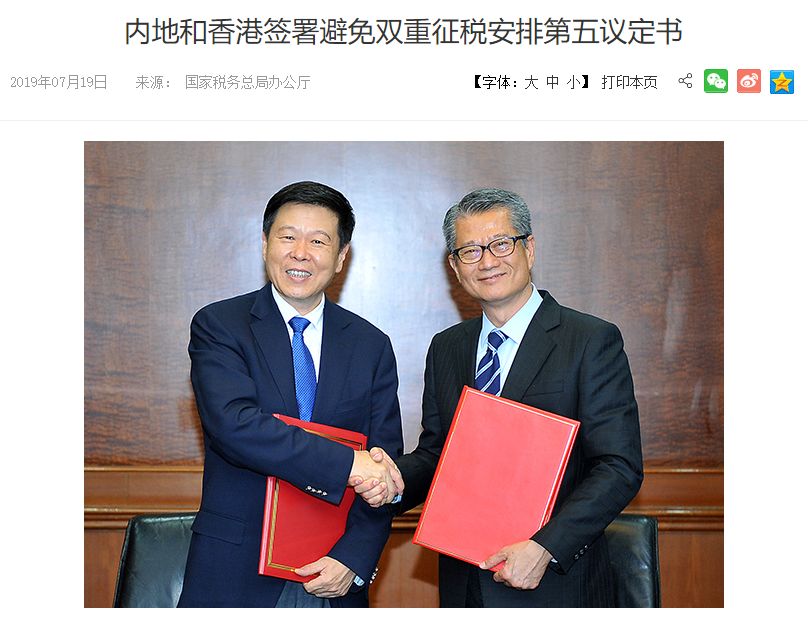 7月19日,國家稅務(wù)總局局長王軍與中國香港特別行政區(qū)財(cái)政司司長陳茂波在北京簽署了《內(nèi)地和中國香港特別行政區(qū)關(guān)于對所得避免雙重征稅和防止偷漏稅的安排》第五議定書。