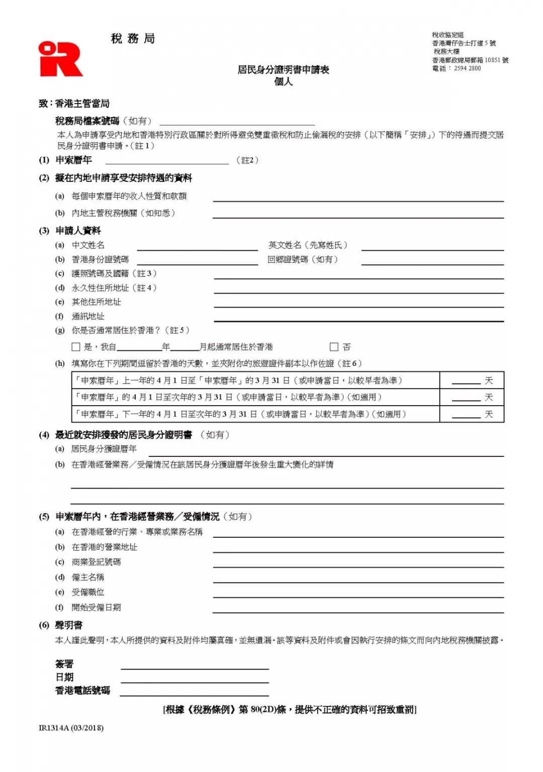 然而,中國香港并非以稅收居民作為征稅的原則,企業(yè)在中國香港納稅也不代表該企業(yè)就是。居住于中國香港的個人或在中國香港成立或管理及控制的公司如要證明其中國香港居民身份,必須要獲得中國香港特別行政區(qū)稅務(wù)主管當(dāng)局出具的《中國香港特別行政區(qū)居民身份證明書》。(TRC)。
