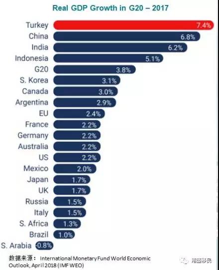 2003年-2017年,土耳其經(jīng)濟(jì)經(jīng)歷了15年的高速發(fā)展。在2017年OECD對G20成員國GDP實際增速的統(tǒng)計中,土耳其以7.4%的增速位列之首。2018年GDP排名18,超過瑞士(20)和中國香港(35)