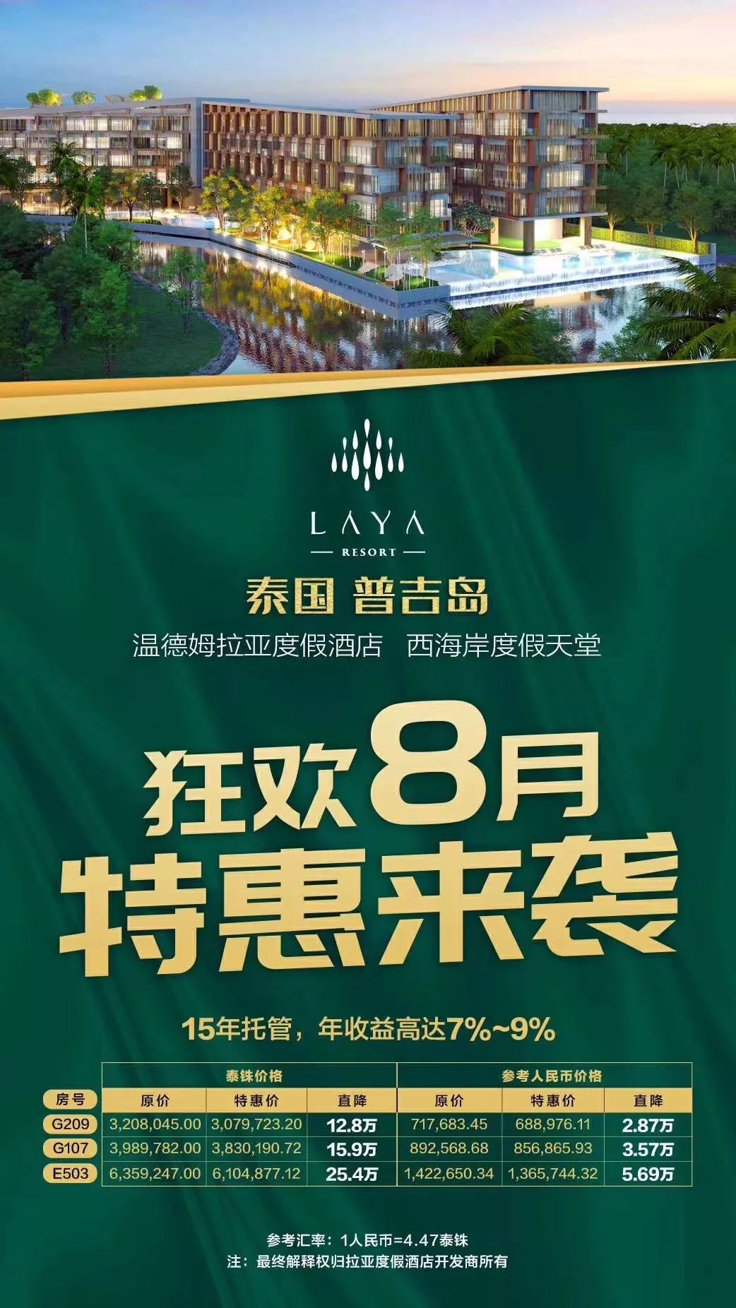 目前晉昇國際泰國普吉島拉亞酒店熱賣中,特此拿出3套特價(jià)房,包租15年,年收益達(dá)7%-9%,8月買到絕對是賺到!立即咨詢晉昇國際顧問或撥打電話:400-8330866搶占先機(jī)!