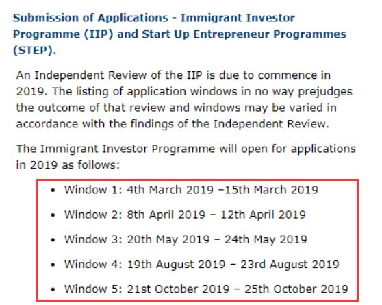 愛爾蘭投資移居計(jì)劃(The Immigrant Investor Programme, IIP)自2012年開放,主要面向想要投資移居愛爾蘭的非歐盟國(guó)家公民。投資移居投資移居的最低投資額為100萬歐元,最短投資期為3年,家庭凈資產(chǎn)需達(dá)到最低200萬歐元 。愛爾蘭移居局也公布了2019年的申請(qǐng)窗口,具體如下: