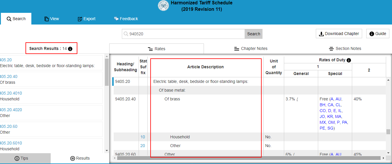 進入上述網(wǎng)站,在搜索框中輸入中國HS CODE的前六位數(shù),如臺燈940520****,根據(jù)產(chǎn)品描述選擇準確的HTS CODE。