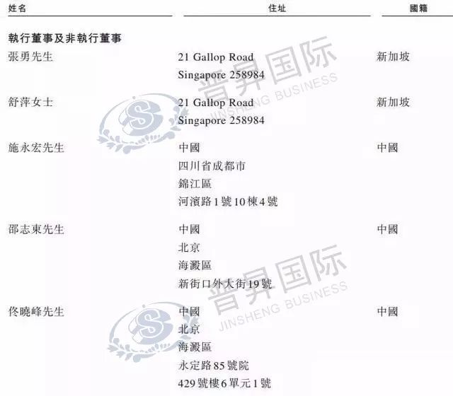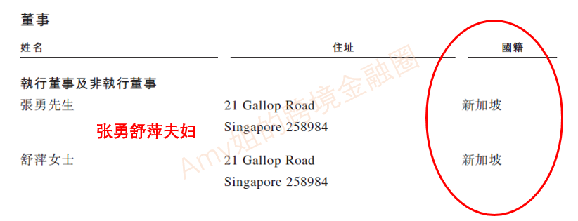 但直到消息被證實(shí)是在2018年上市之期。根據(jù)2018年海底撈向港交所遞交的招股說(shuō)明書,公司負(fù)責(zé)人的國(guó)籍、住址一列顯示,張勇、舒萍夫婦二人的國(guó)籍、住址均在新加坡。
