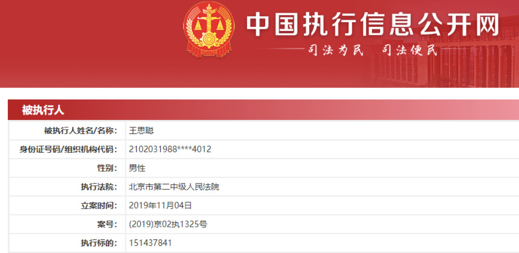 11月4日,王思聰被北京市第二中級人民法院列為被執(zhí)行人,執(zhí)行標(biāo)的151437840.0,約1.5億。隨后北京二中院采取了凍結(jié)賬戶存款、查封房產(chǎn)、車輛、限制高消費(fèi)等執(zhí)行措施。