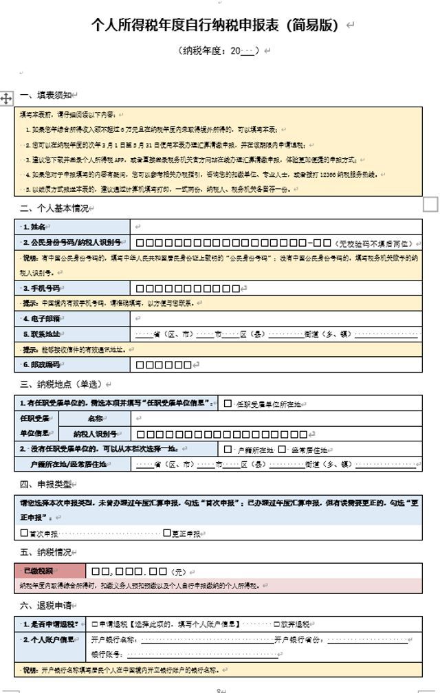 (2)《個人所得稅年度自行納稅申報表(A表簡易版)》