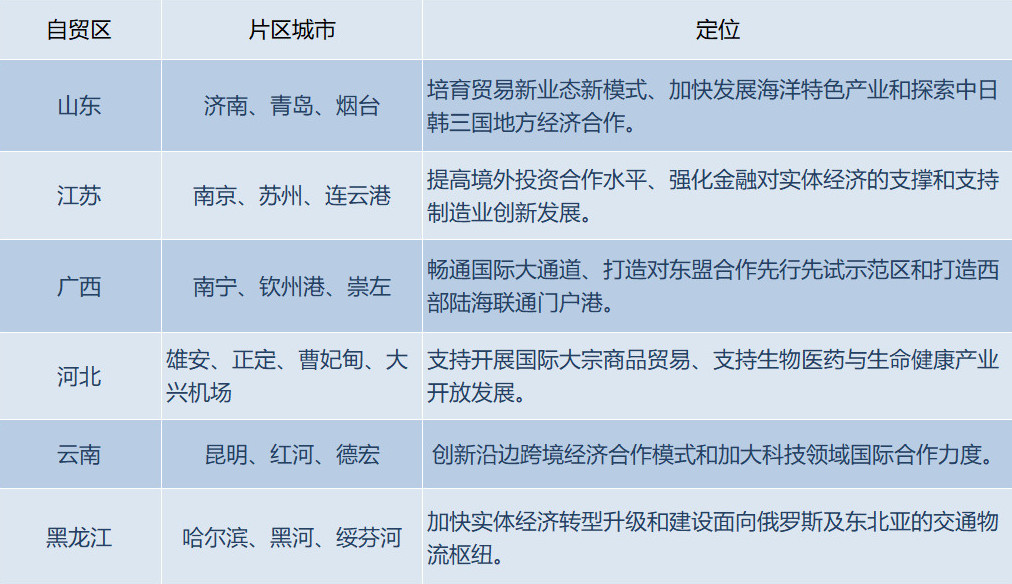 8月26日,國務院印發(fā)《中國(山東)、(江蘇)、(廣西)、(河北)、(云南)、(黑龍江)自由貿易試驗區(qū)總體方案》。8月30日,6個新設自貿試驗區(qū)正式掛牌成立。隨著山東、江蘇、河北新設自貿區(qū),我國沿海省份自貿區(qū)實現全覆蓋;而廣西、云南、黑龍江新設自貿區(qū),則讓自貿區(qū)在沿邊地區(qū)首次落地生根。
